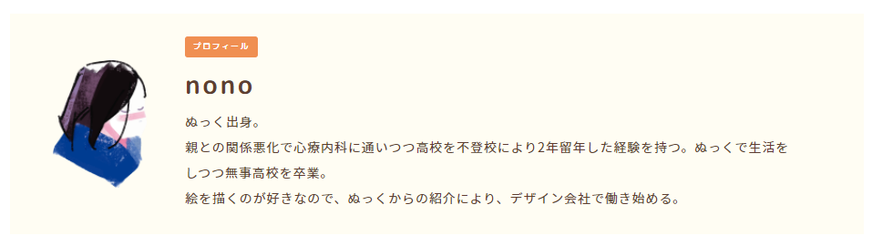 またサイト内で使用されているイラストは、ぬっくハウスを過去に利用し、今はデザイン関係の仕事をしている”nono”さんに作成してもらいました。